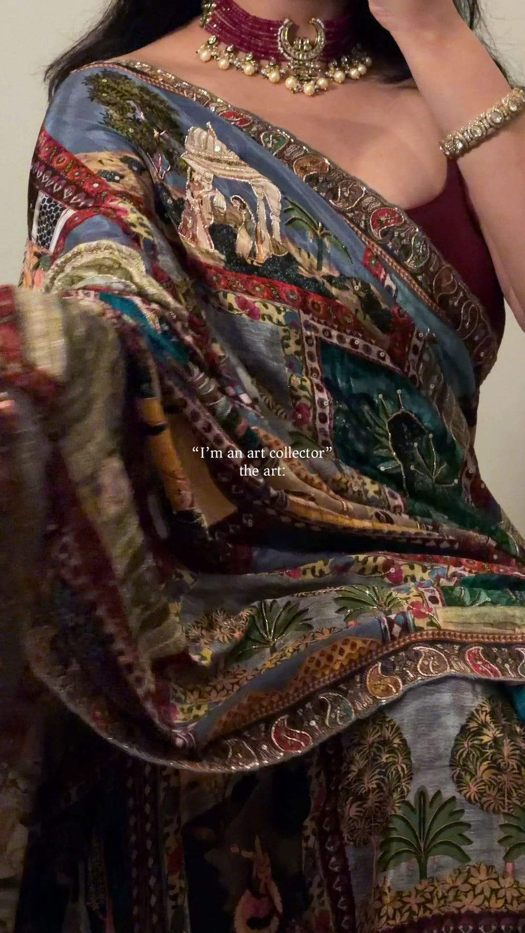 The fluid drape of Bemberg Crepe lends this saree an effortless grace, while the vivid print makes it nothing short of wearable art. Lovingly adorned with intricate hand embroidery and shimmering mirror work, every inch of this saree speaks to centuries of fine craftsmanship — refined, radiant, and deeply personal.